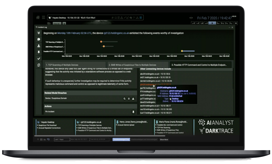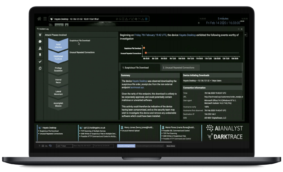 Cyber AI Analyst is Darktrace’s AI investigation technology, which automatically triages, interprets, and reports on the full scope of security incidents.