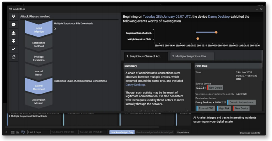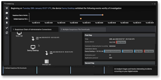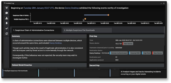 With this knowledge, Cyber AI Analyst is able to understand which threats are most crucial for investigation, which events constitute a connected incident, and how an attack should be managed.