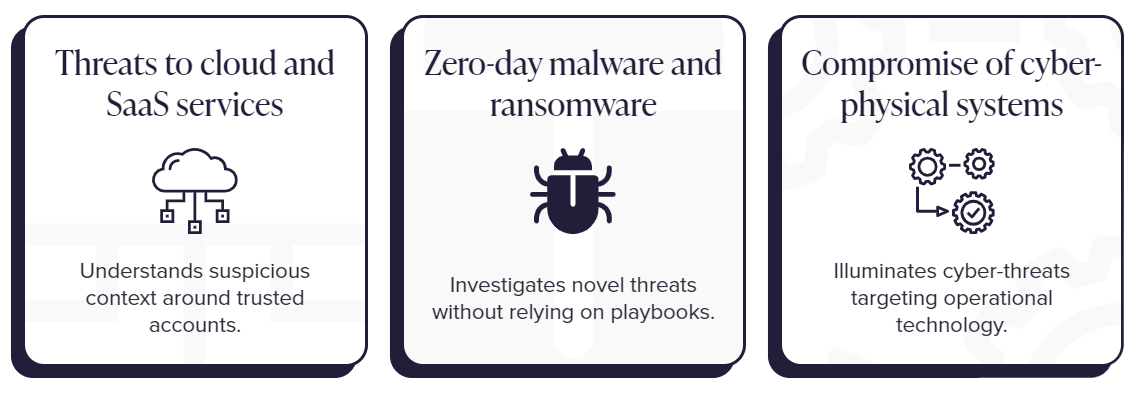 The technology combines expert analyst intuition with the consistency, speed, and scalability of AI. It illuminates the highest priority threats at any one time and rapidly synthesizes all of the context around an attack into a human-readable report.